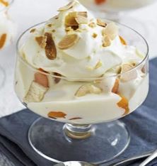 - Just before serving, add the remaining Disaronno to the cream and whip until it just holds its shape. Spoon over the custard and sprinkle with flaked almonds.
