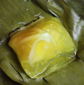 - Fill the coconut leaf boxes with the coconut flesh mixture and place the green bean filling in the centre.