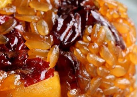 7. When the rice has finished cooking for 15-20 minutes, remove from heat and place inside the prepared quarter sheet pan or baking pan. Press the mixture down firmly to make sure everything sticks together. Decorate with the reserved jujube pieces. Let cool for about 15 minutes.