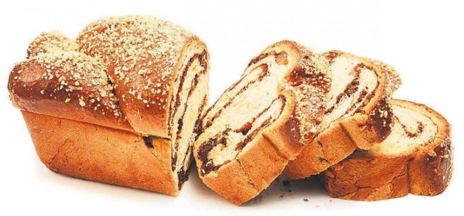 - Take a piece of the mixture, spread it well and put it over the nut cream with Belgian chocolate, Turkish Delight and raisins then roll everything together. Cut the roll in two along its length and then weave the two parts together and brush with egg.