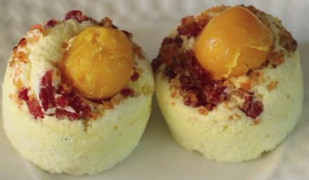 After baking it and it looks almost done, but the center is still uncooked, open the oven and place a cooked salted Egg in the center.