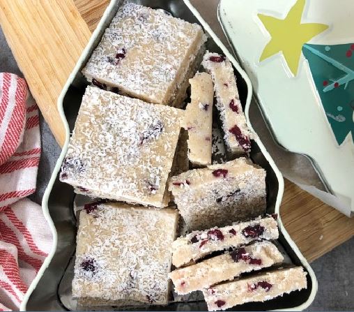 - Stir the cranberries through the coconut mixture.